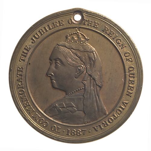 Bust of Queen Victoria left but with head slightly front so that her right eye can just be seen, wearing small crown. Around, TO COMMEMORATE THE JUBILEE OF THE REIGN OF QUEEN VICTORIA . 1887 .