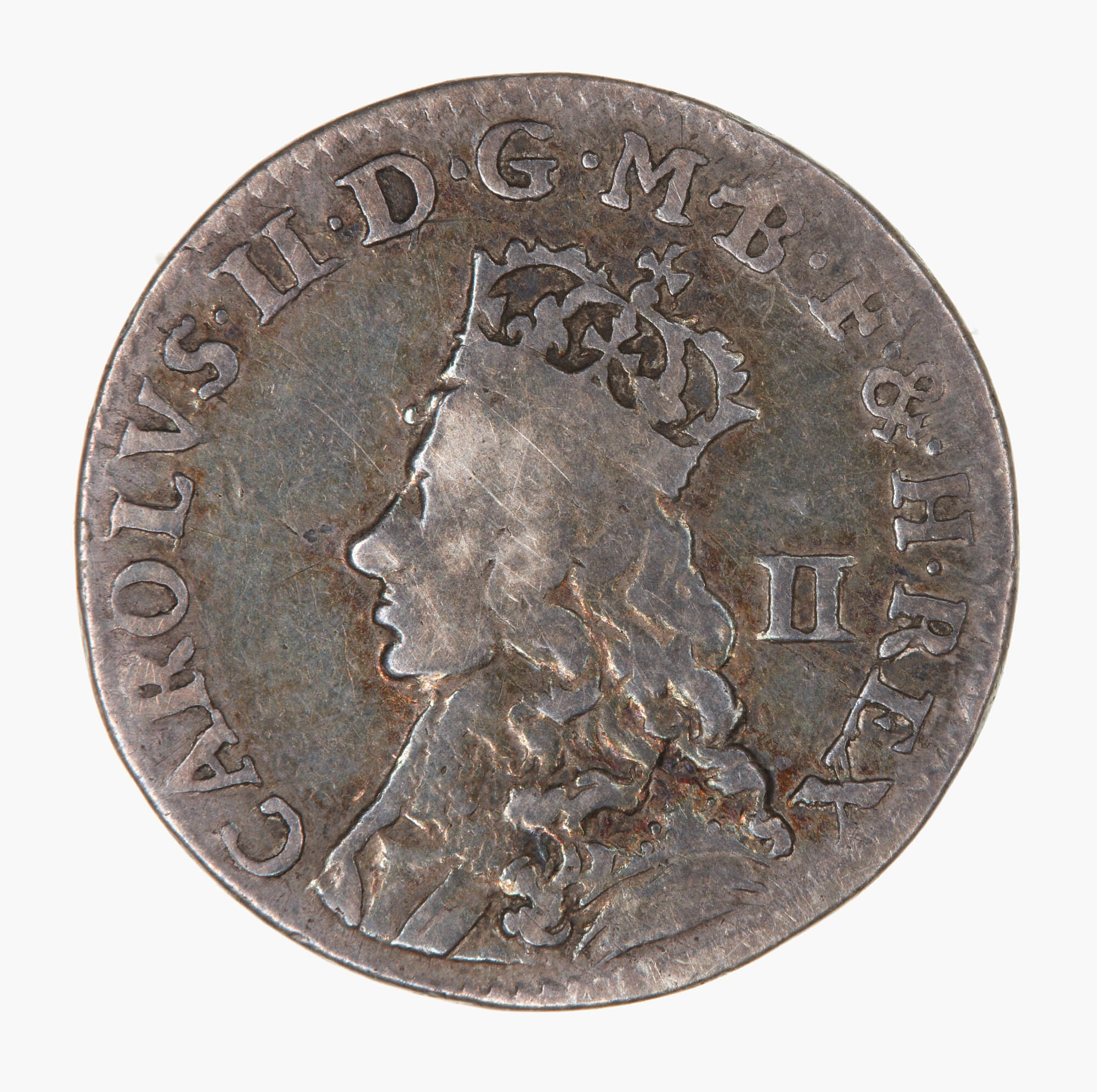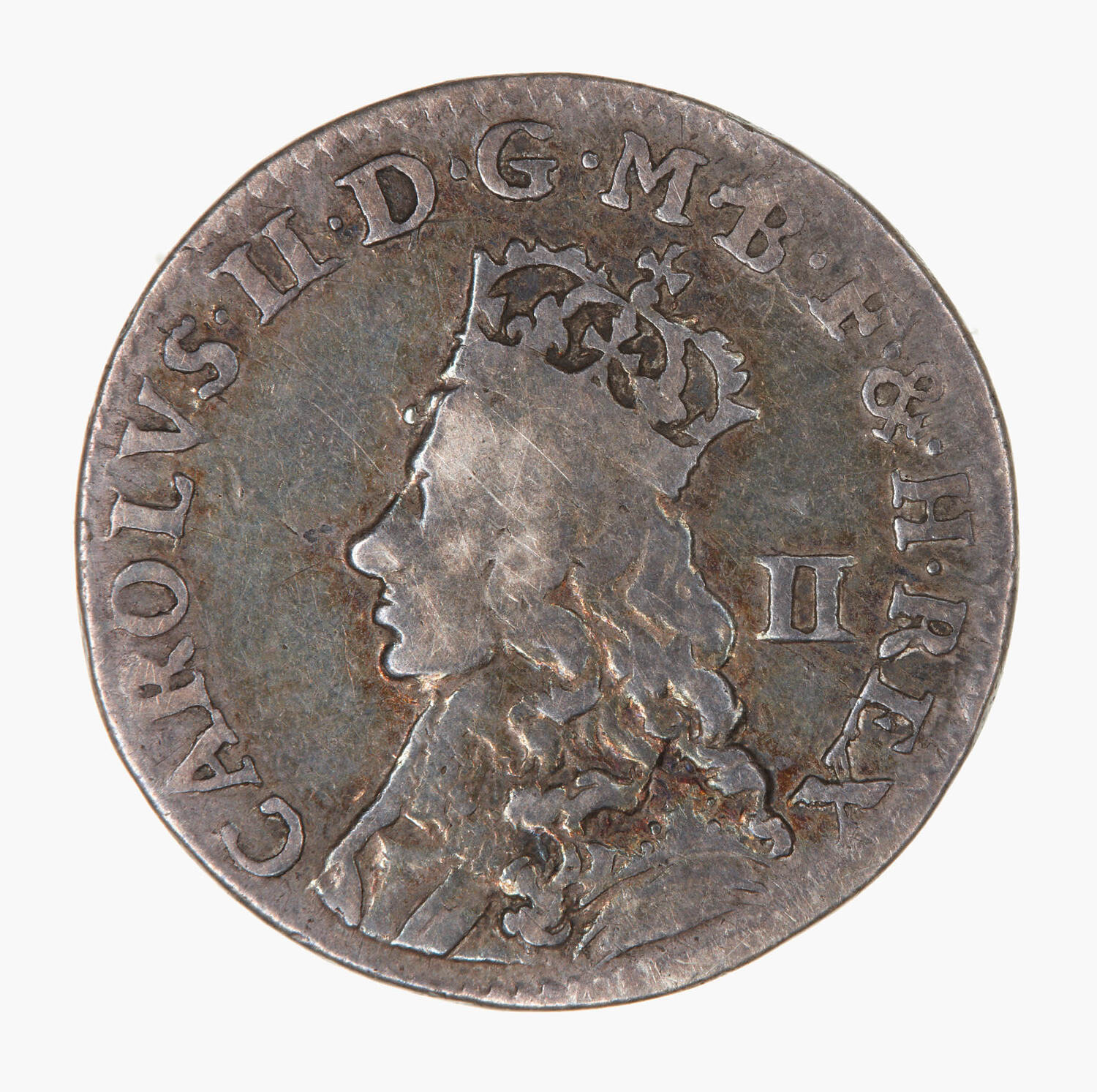 Crowned and draped bust of Charles II, facing left; in field behind head the denomination, II around, CAROLVS . II . D . G . M . B . F. & H . REX.