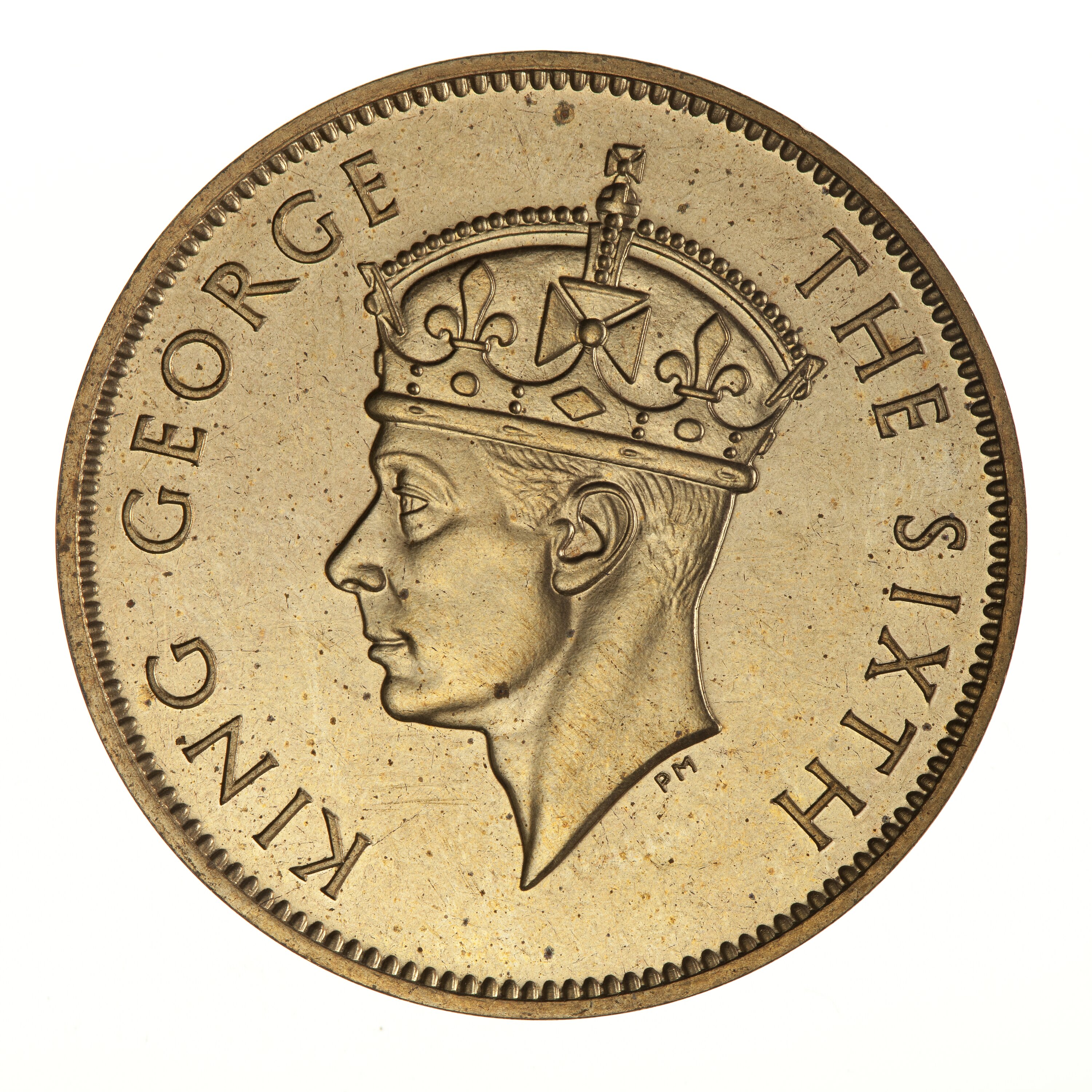 A crowned head of the King facing left; around, KING GEORGE THE SIXTH; below head the artist's initials, PM