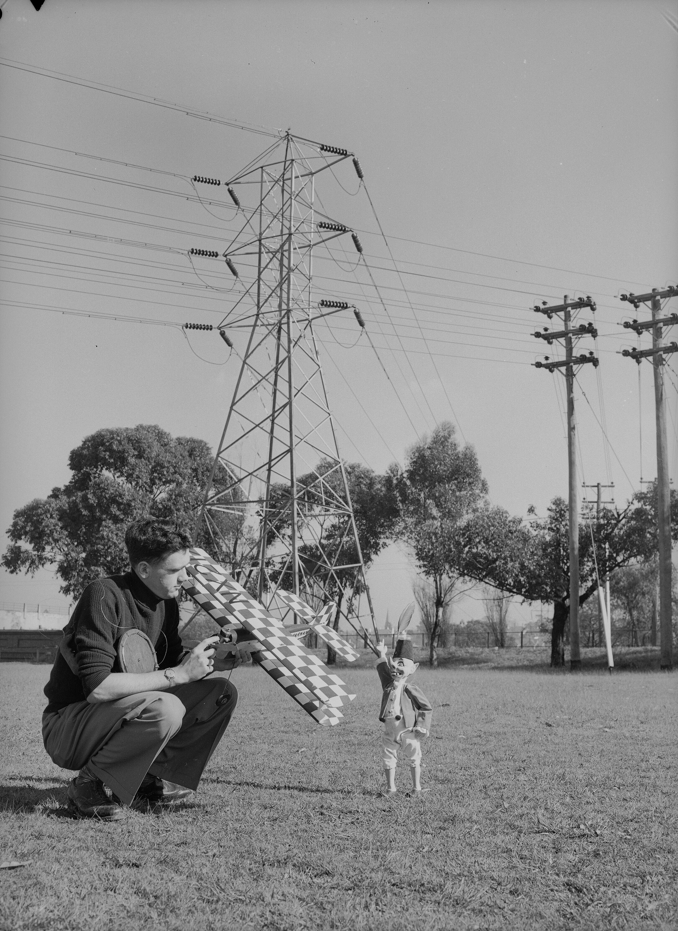Man with puppet and model aircraft, warning against flying models near transmission lines. Illustration for 'Shocko' safety bulletin.