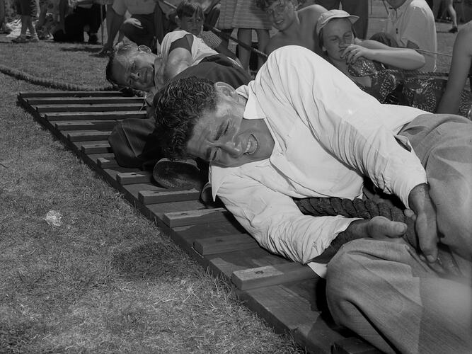 Staff members competing in a tug-o-war event at the annual staff picnic held by the State Electricity Commission in 1953.