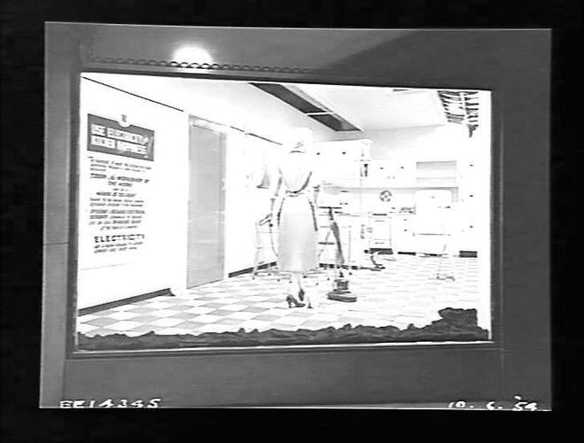 Window display, Flinders Street - kitchen: 'Use electricity for kitchen happiness'.