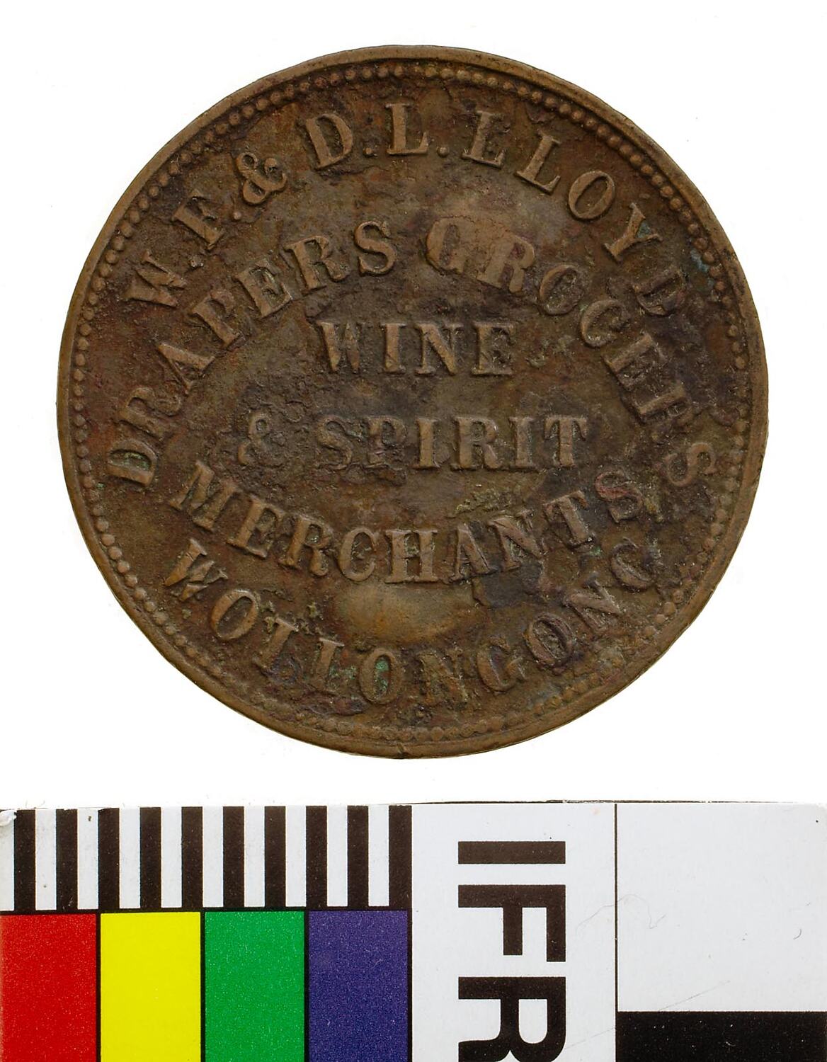 Obverse: W.F. & D.L. LLOYD DRAPERS GROCERS WINE & SPIRIT MERCHANTS WOLLONGONG Reverse: ADVANCE AUSTRALIA COLONIAL PRODUCE TAKEN IN EXCHANGE (1859)