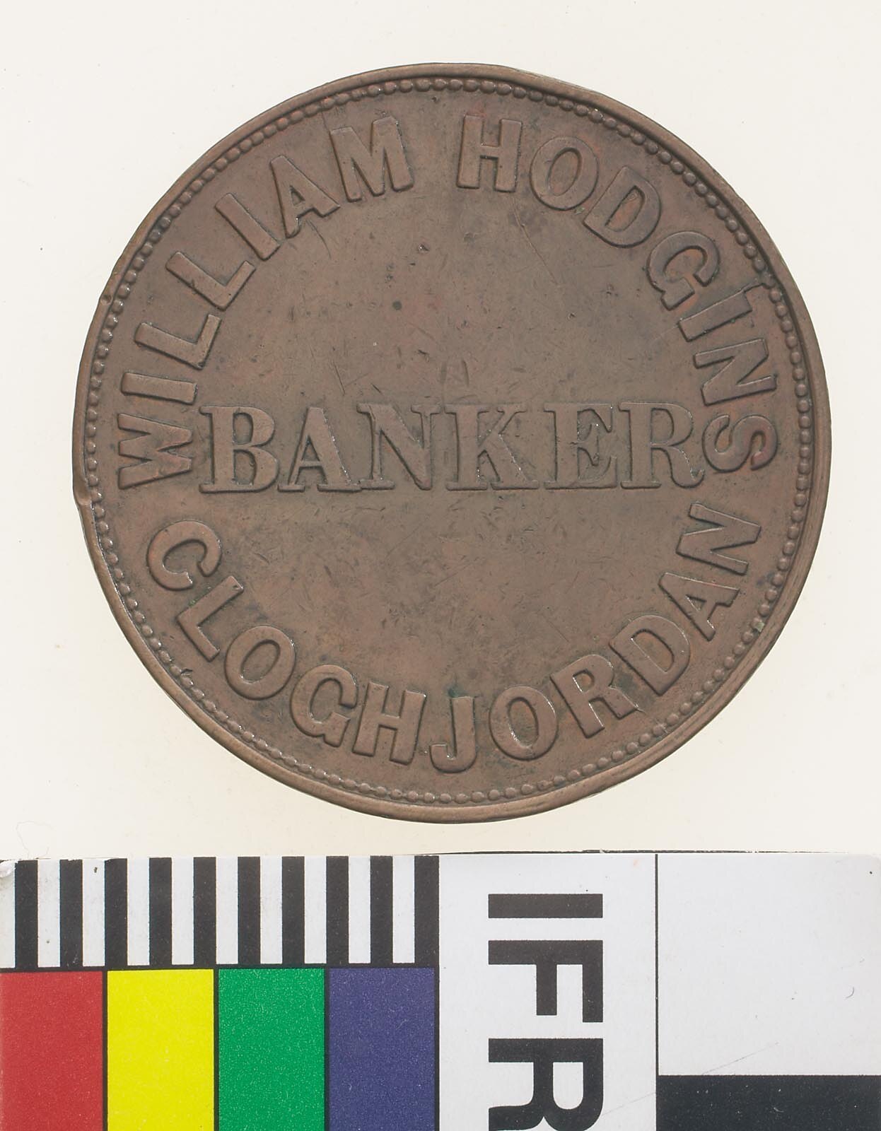 Across centre, BANKER; above, WILLIAM HODGINS; below, CLOGHJORDAN Small die crack to I of HODGINS