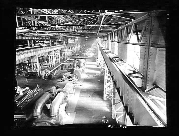 Yallourn Power Station turbine room, showing the two 'C' station Parsons turbines in the foreground, and behind, in the distance, 'A' and 'B' turbines. (NB: Negative is of poor quality).