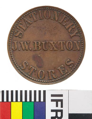 A round copper token (34 mm diameter). The token features the name address and business of the issuer: J.W. Buxton, Ladies Warehouse Brisbane, Stationery Stores.