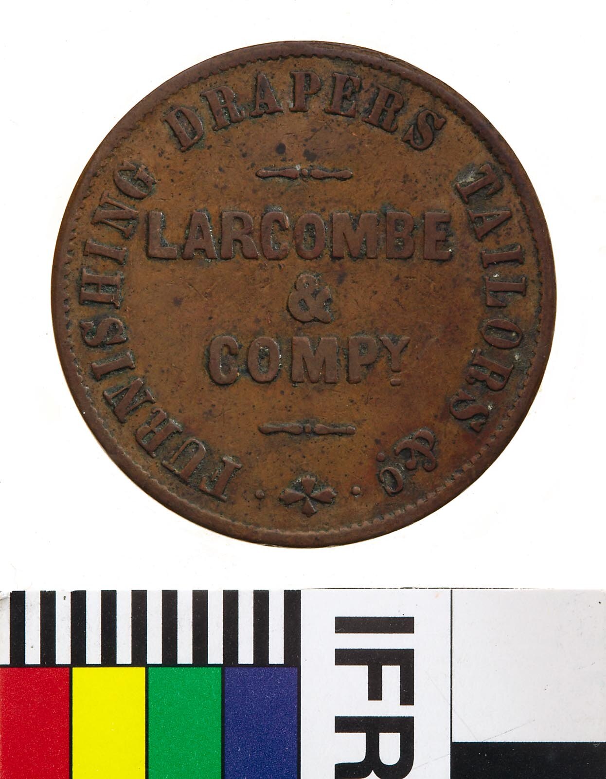 A round copper token (33 mm diameter). The token features the name address and business of the issuer: Larcombe & Compy., Brisbane, Furnishing, Drapers, Tailors etc.