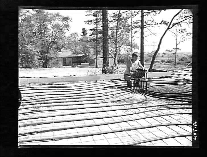 Heating element in concrete slab; worker adjusting controls.