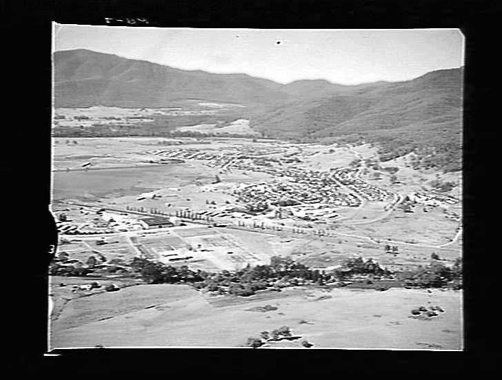 Mt Beauty town - aerial view - switch yard in foreground, 1960.