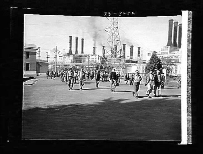 Workers leaving Yallourn power station. Image shows a corner of the admin block, and stations C, B, A and D. Station E may be out of sight on the right, or not yet operating. Image also shows a transmission tower and electricity poles.