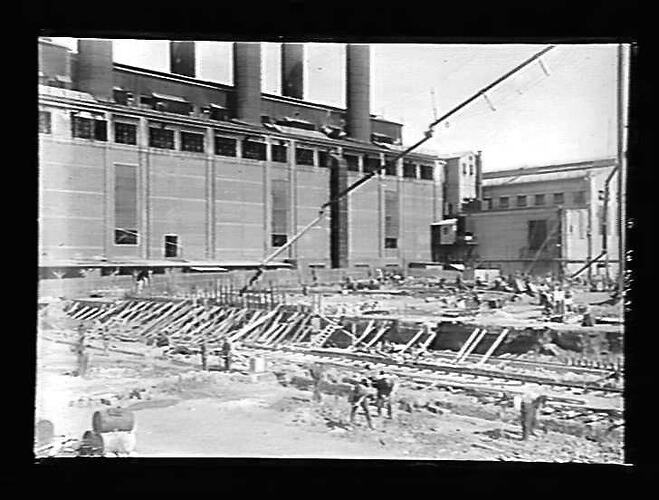 Foundations for the Yallourn 'B' power station boiler house, 1929, immediately adjacent to the 'A' boiler house (left and centre) and turbine house (right). Image shows several workmen in the foreground.