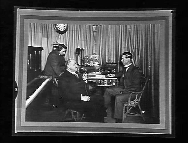 Negative of a photograph of John Monash (1865-1931), likely taken in a broadcasting studio on 21 September 1923. Monash was an engineer, decorated World War I military leader and general manager of the State Electricity Commission of Victoria.