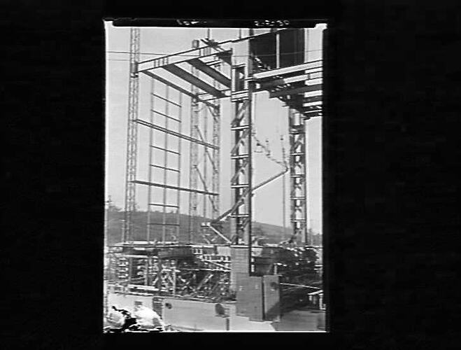 Construction of Yallourn 'B' boiler house framework. (NB: negative damaged at lower left corner).