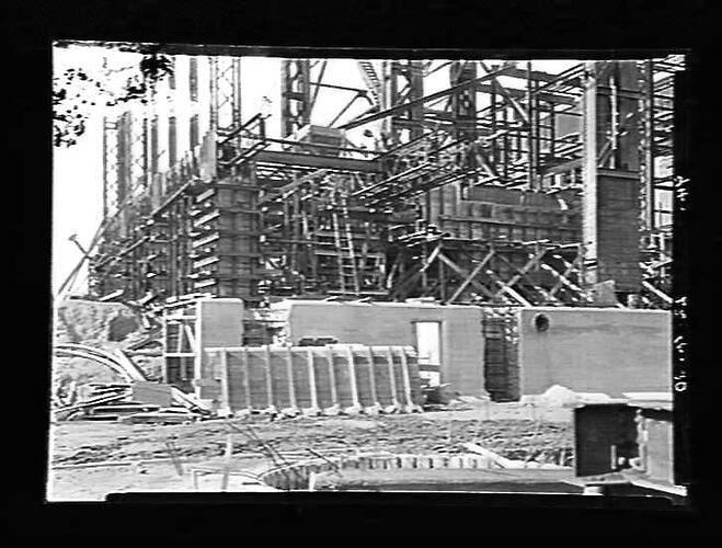 Construction of Yallourn 'B' boiler house lowest level, showing preparation for concrete pour. (NB: negative damaged at upper left corner).
