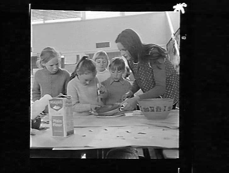 Cooking class for children: demonstrator with cake pan.