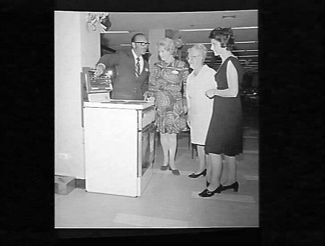 Sales representative demonstrating stove to three women.
