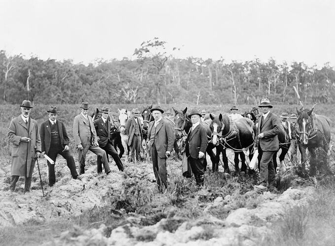 Commissioners and senior staff of the State Electricity Commission witnessing the turning the first sod for Yallourn 'A' Power Station on 5th February 1921. The men in the foreground from left to right are identified as follows: Mr C.H. Kernot (then Construction Engineer at Yallourn, later the SECV's Chief Engineer), Mr A.H. Merrin (later Secretary for Mines & Public Works), Sir Thomas Lyle (Commissioner), Mr R. Liddelow (then Secretary to the SECV, and later Manager), Hon George Swinburne (Commissioner), Sir John Monash (holding rolled plans - Chairman of SECV) and Sir Robert Gibson (Commissioner).