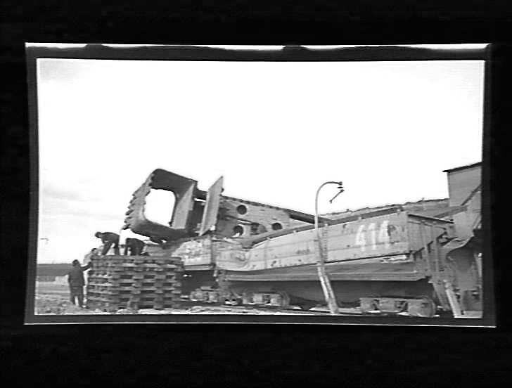Accident: bucket of steam shovel has collapsed onto railway truck. Bucket resting on railway truck.