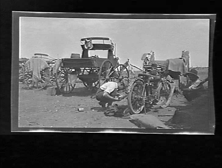 Man attending to motor-bike, buggies in background.