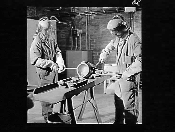 Induction leaking. Furnace, Norken Limited. Two men pouring into mould from crucible.