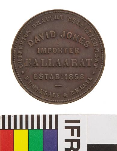 Obverse: DAVID JONES IMPORTER BALLAARAT ESTAB:1853 CRITERION DRAPERY ESTABLISHMENT WHOLESALE & RETAIL Reverse: CRITERION HOUSE DAVID JONES PROPRIETOR STURT ST., BALLAARAT 1862