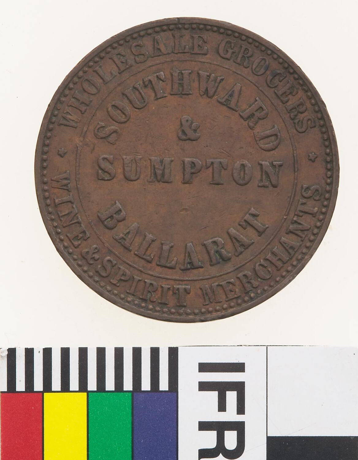 Obverse: SOUTHWARD & SUMPTON BALLARAT WHOLESALE GROCERS WINE & SPIRIT MERCHANTS Reverse: SOUTHWARD & SUMPTON BALLARAT ADVANCE BALLARAT