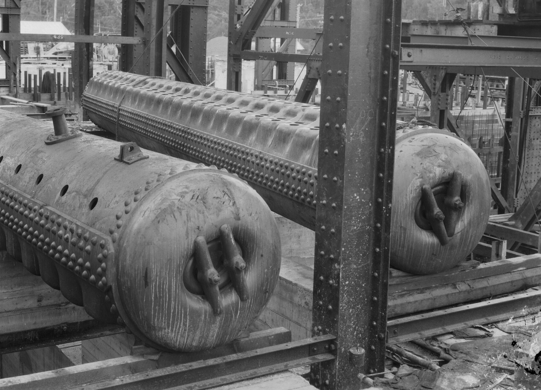 Construction of Yallourn 'B', installation of boiler drums. (NB: negative damaged at lower right corner).