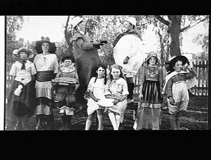Group portrait of ten children dressed in fancy dress - clowns etc.