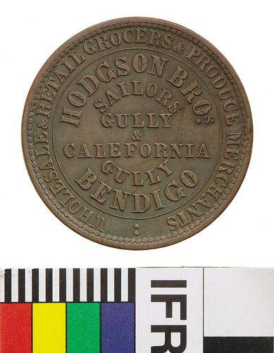 Obverse: HODGSON BROS. SAILORS GULLY & CALEFORNIA GULLY BENDIGO WHOLESALE & RETAIL GROCERS & PRODUCE MERCHANTS Reverse: VICTORIA 1862 ADVANCE VICTORIA T. STOKES MAKER 100 COLLINS ST. EAST MELBOURNE