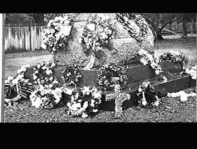 Base of war memorial with a large number of floral arrangements placed on and about.