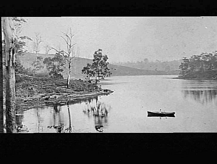 'Unknown'. View of wide river or inlet. A small boat is in the middle.