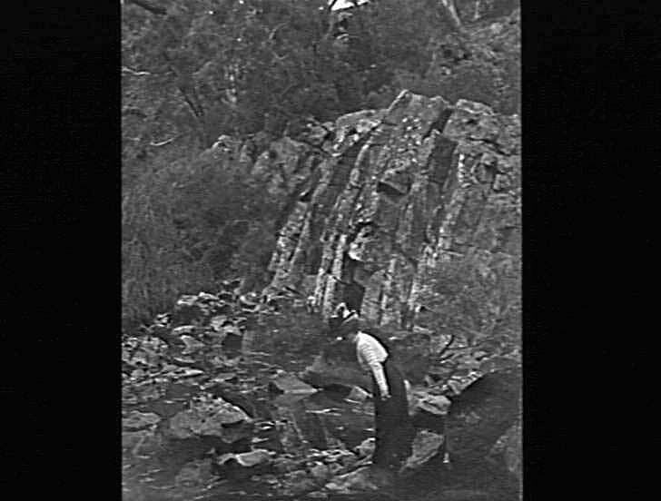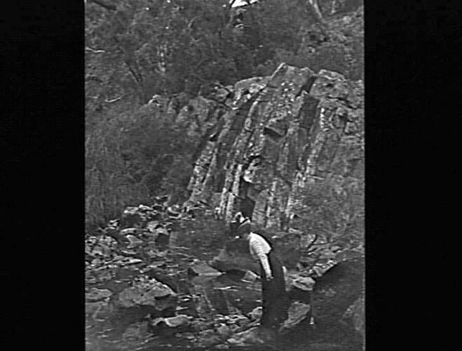'Tasmania'. Portrait of woman standing in a rocky gully.