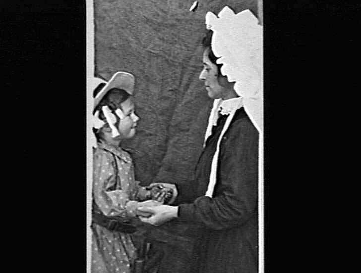Self portrait of Lilian Pitts with Dorothy. The young girl Dorothy has her curls tied with ribbons.