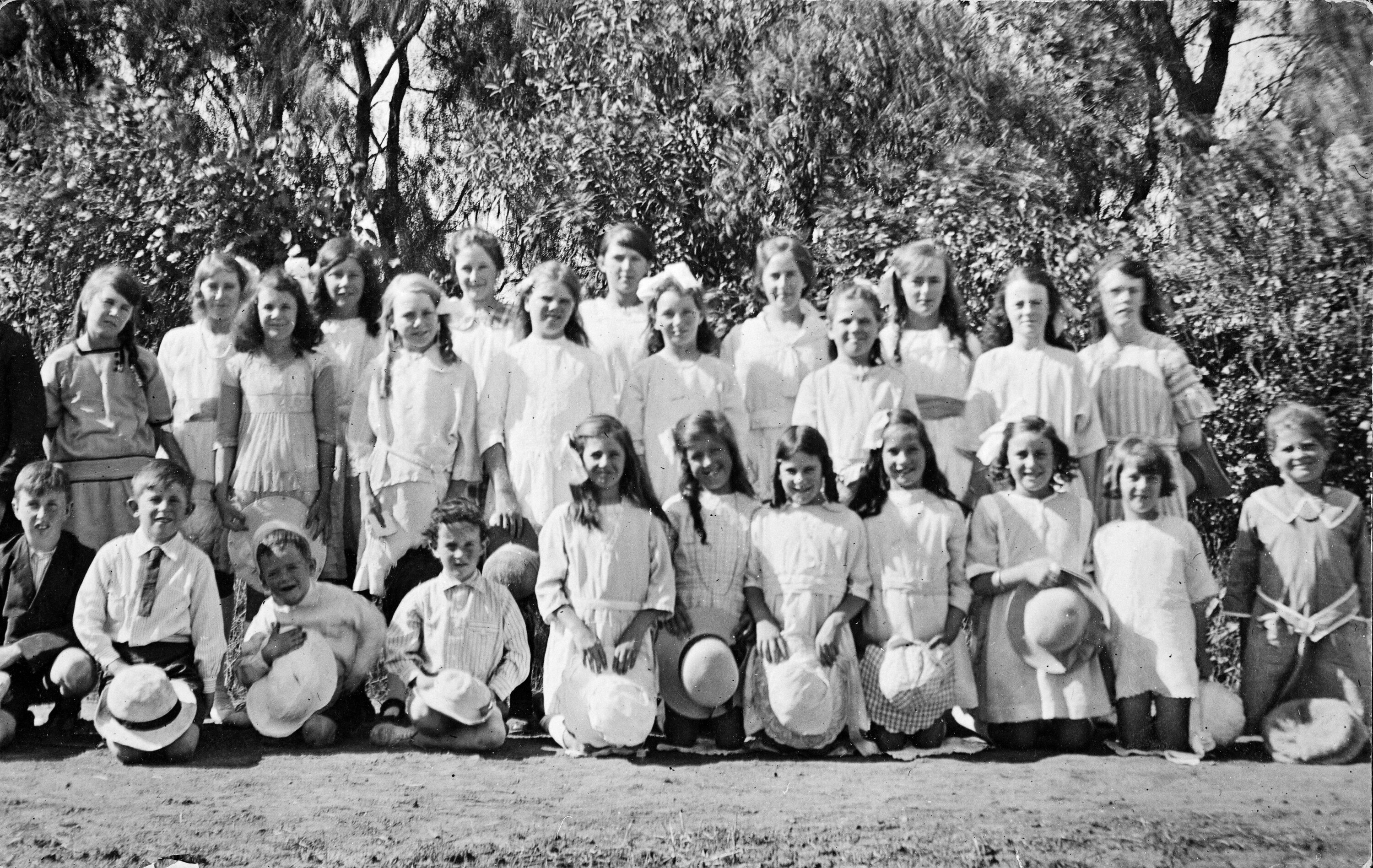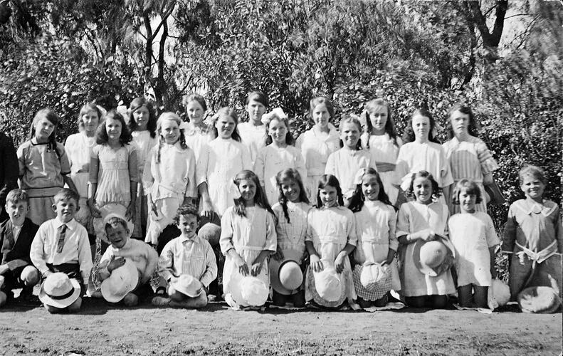 Black and white negative of Lilian Pitts' students at Othery House, Merrigum, Victoria, circa 1910s.