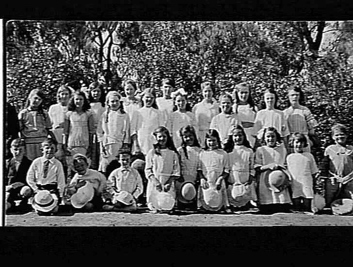 Group of about twenty-five students in three lines, the front line kneeling or sitting holding their hats.