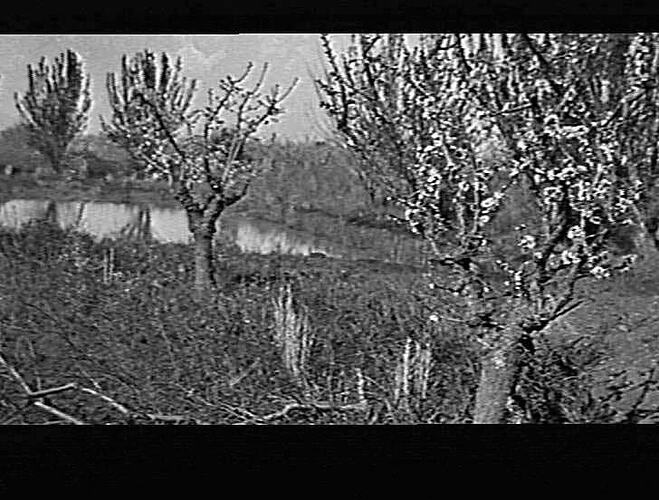 General view of orchard with fruit trees flowering.