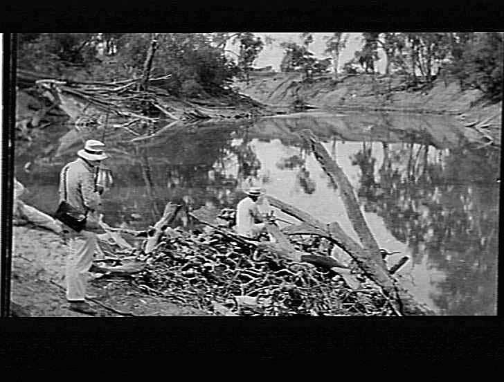 Landscape of Goulbourn River. Two men, one sits on logs, view the area. Trees have been felled and there is evidence of soil erosion on the banks of the river.