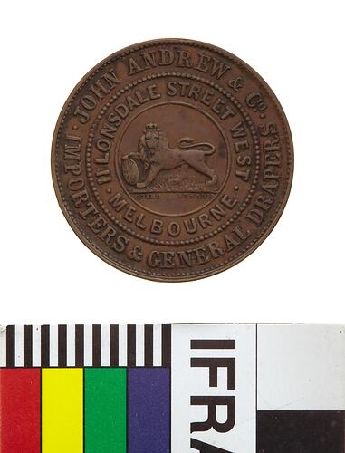 At centre, male lion standing to left with head crowned facing front, its right paw is raised and rests on a shield bearing the Union Jack, its tail curved back over its body. around in two concentric circles of text devided by a beaded circle * JOHN ANDREW & CO. * IMPORTERS & GENERAL DRAPERS / 11 LONSDALE STREET WEST * MELBOURNE * In small letters in the exergue below the lion, COARD LONDON