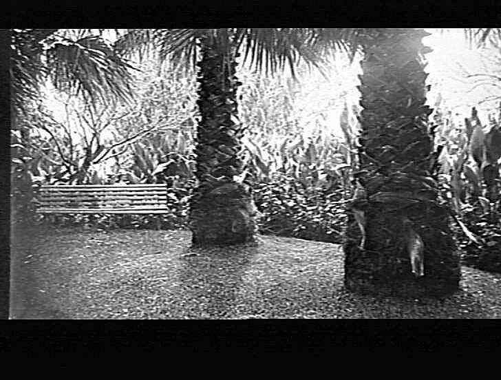 Lawn area with two palm trees. The area is bounded by ferns. A garden bench seat stands at one end.