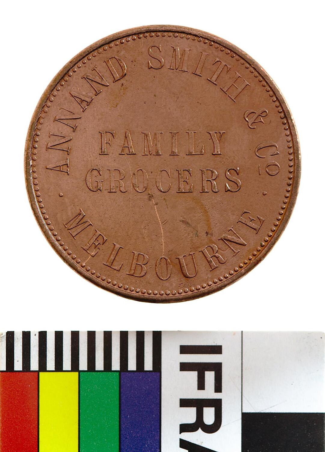 Legend in four lines within a border of 132 beads, ANNAND SMITH & CO / FAMILY / GROCERS / .MELBOURNE. the first and last lines are curved