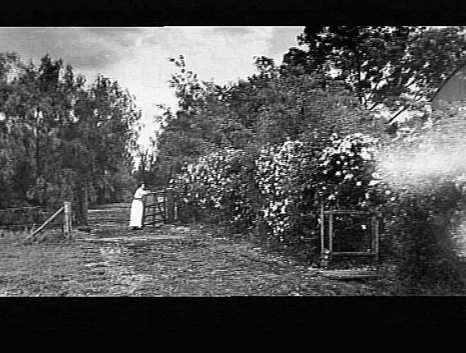 Woman opening gateway in middle distance, flowering bushes divide area between side of house and driveway.