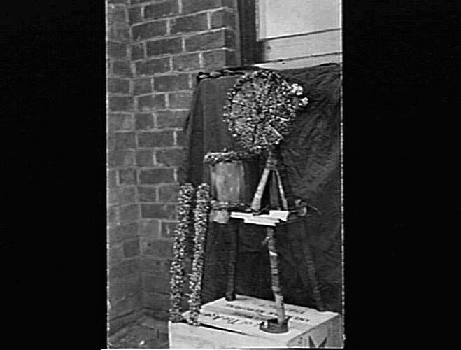 Floral arrangement mounted on a large stand. The photograph is taken outside near a building wall.