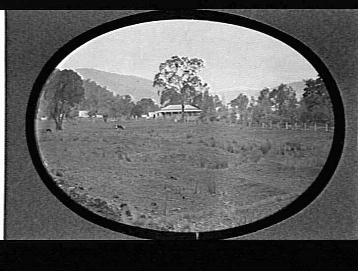 Landscape view taken at Mount Buffalo and environs in the Victorian Highlands. Shows a farm and farm house. Mounted in oval matt board mount.