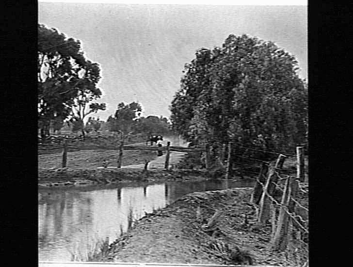 General view in Merrigum area, foreground shows fenced off waterway, background shows road. On far side of road is an unusual fence.