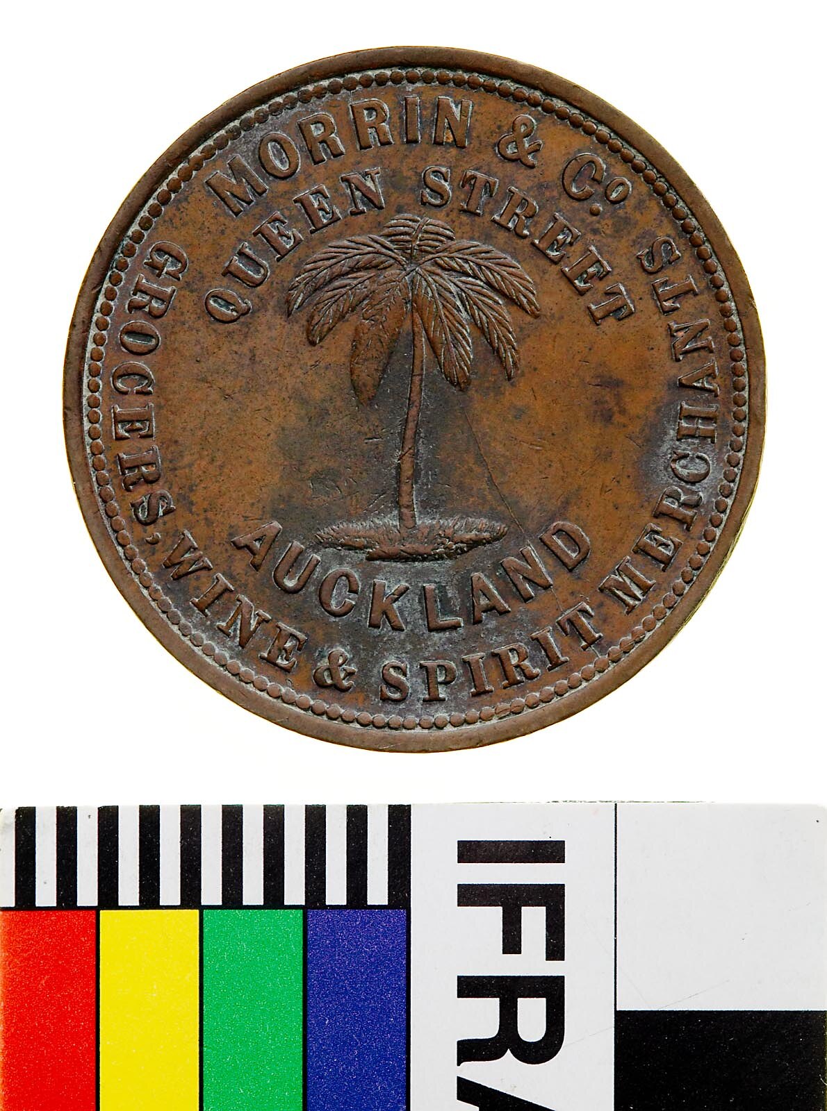 Obverse: MORRIN & Co. QUEEN STREET AUCKLAND GROCERS, WINE & SPIRIT MERCHANTS Reverse: ADVANCE AUCKLAND