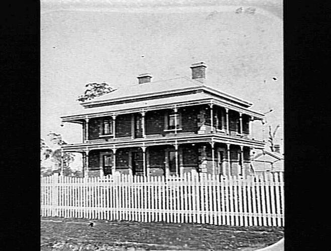 Exterior view of a large brick or stone two storey house with wide verandas on each level. The house is surrounded by a picket fence.