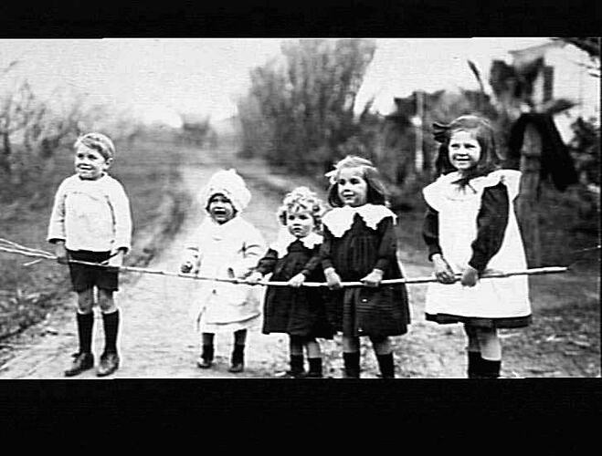Group portrait of five small children, four girls and a boy standing on a road holding a long tree branch.
