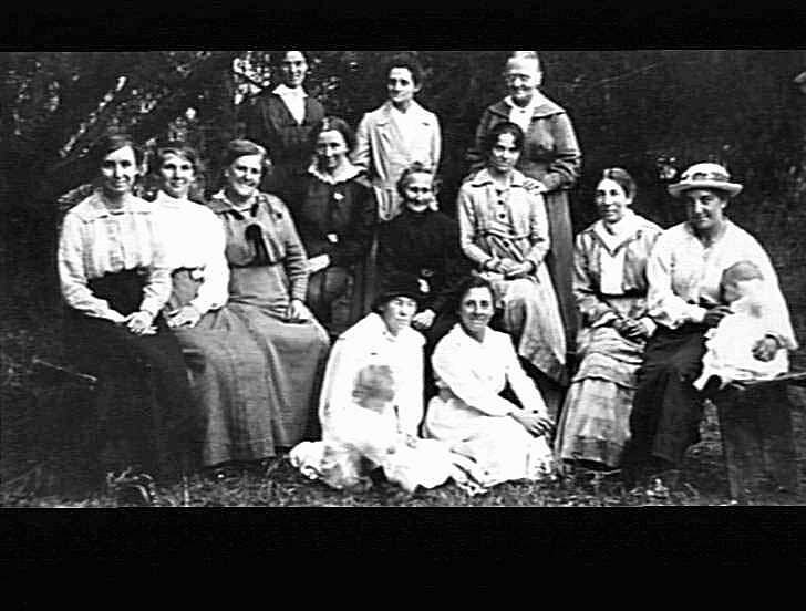 Group portrait of thirteen women. A woman at the far right of the picture is holding a baby.