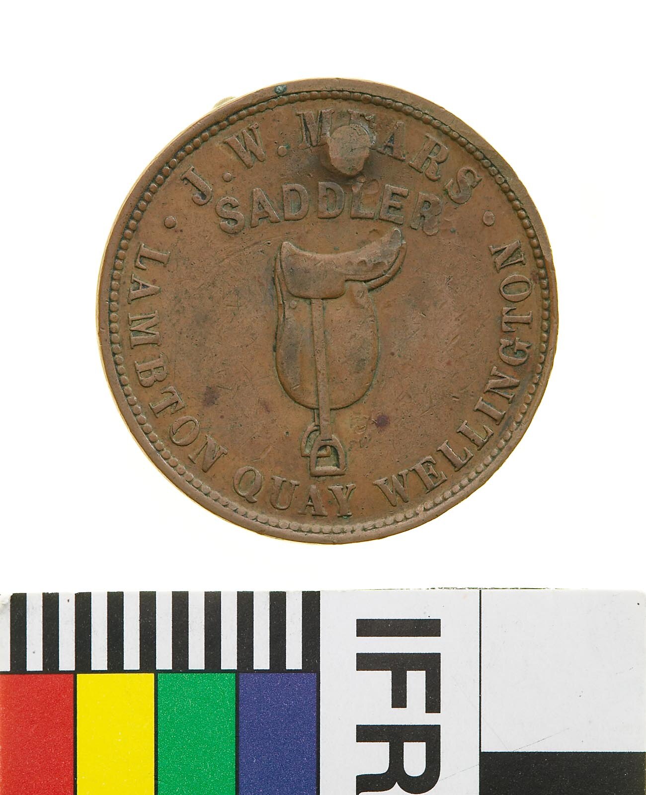 A round copper token (29 mm diameter). The piece features the name, address and business of the issuer: J.W. Mears, saddler, collar and harness maker, Lambton Quay, Wellington. The reverse features saddle.