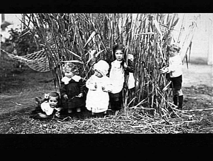 Portrait of a group of five children playing in a clump of tall grass or cane. A hammock hangs in the background.